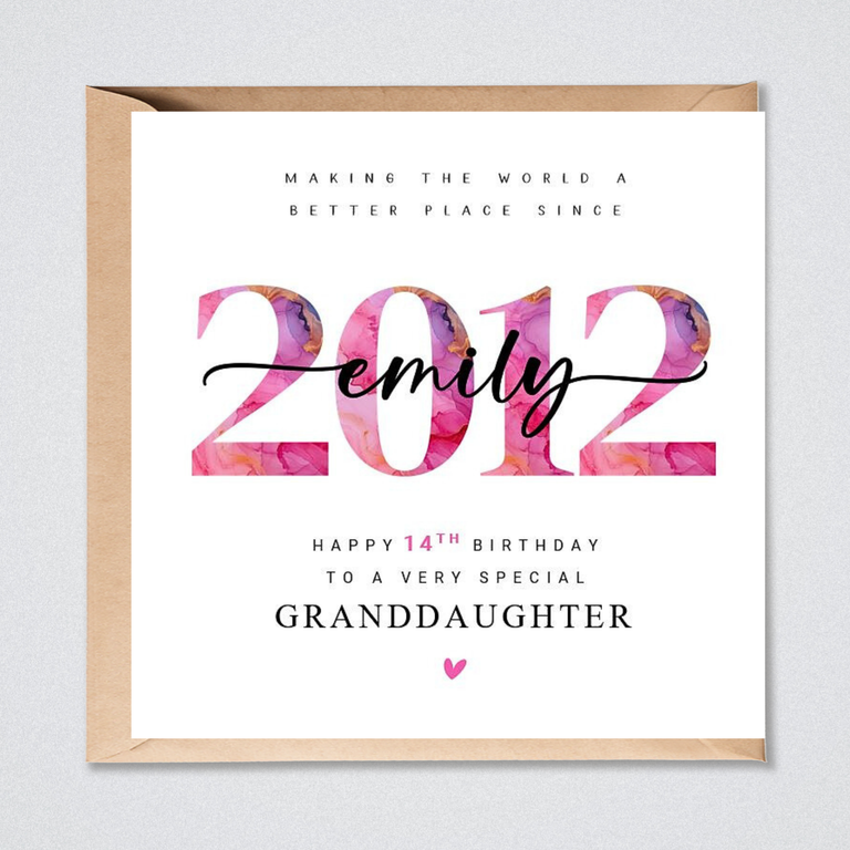 A vivid and colourful vivid pink personalised 14th Birthday card for daughter, granddaughter, sister, niece, goddaughter or friend.