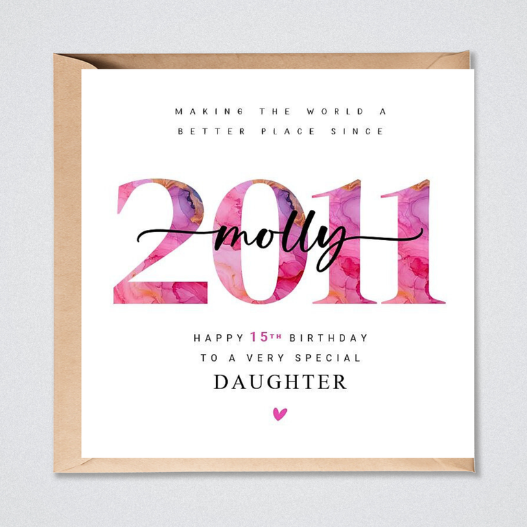 A vivid and colourful vivid pink personalised 15th Birthday card for daughter, granddaughter, sister, niece, goddaughter or friend.