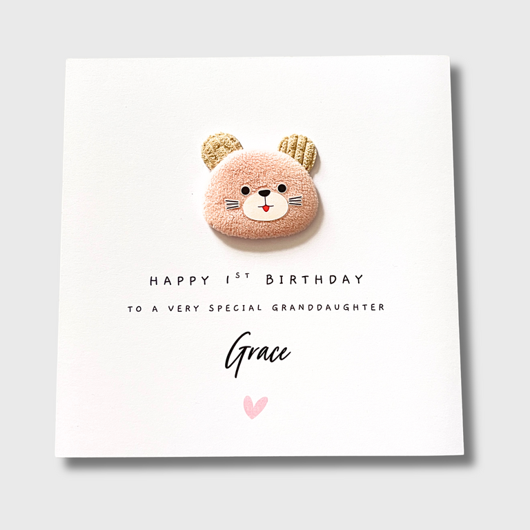 A cute 1st Birthday Card for daughter, granddaughter, niece, cousin, goddaughter, sister, embellished with a cute soft pink cat head motif and personalised with a name.