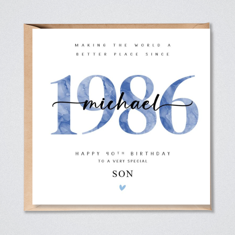 A personalised 40th Birthday Card for son, husband, dad, brother, uncle, nephew, brother-in-law, cousin, friend. Making the World a better place since 1986.