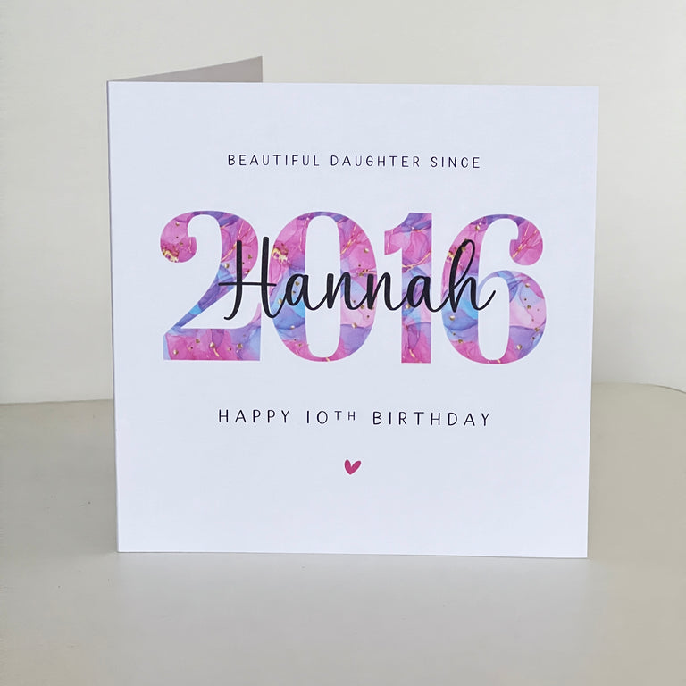 A vivid and colourful 2016 personalised 10th Birthday card for daughter, granddaughter, sister, niece, goddaughter or friend.